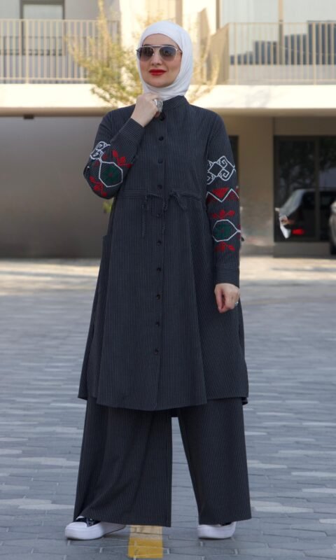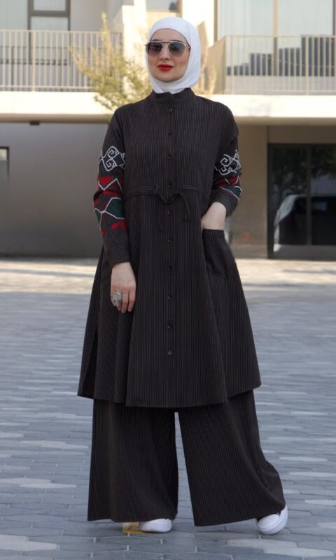 طقم قطعتين شتوي مقلم لون بني غامق