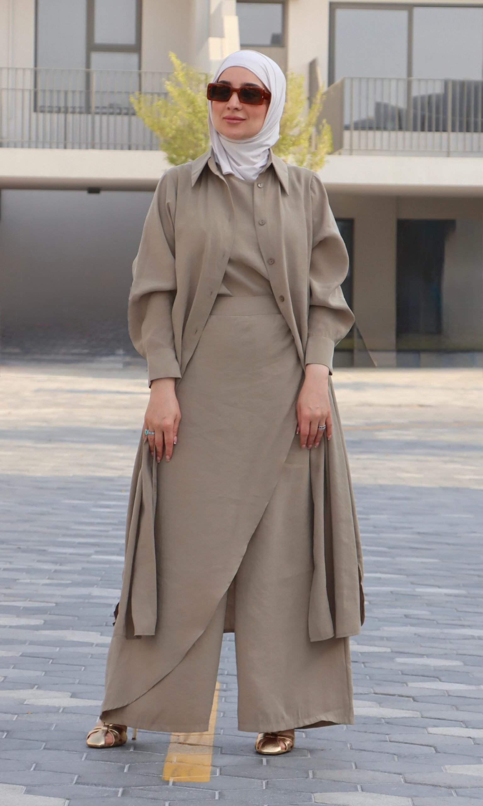 طقم 3 قطع صيفي  (بلوزة كات + بنطلون عريض فوقة ردة + قميص طويل بأزرار ).
