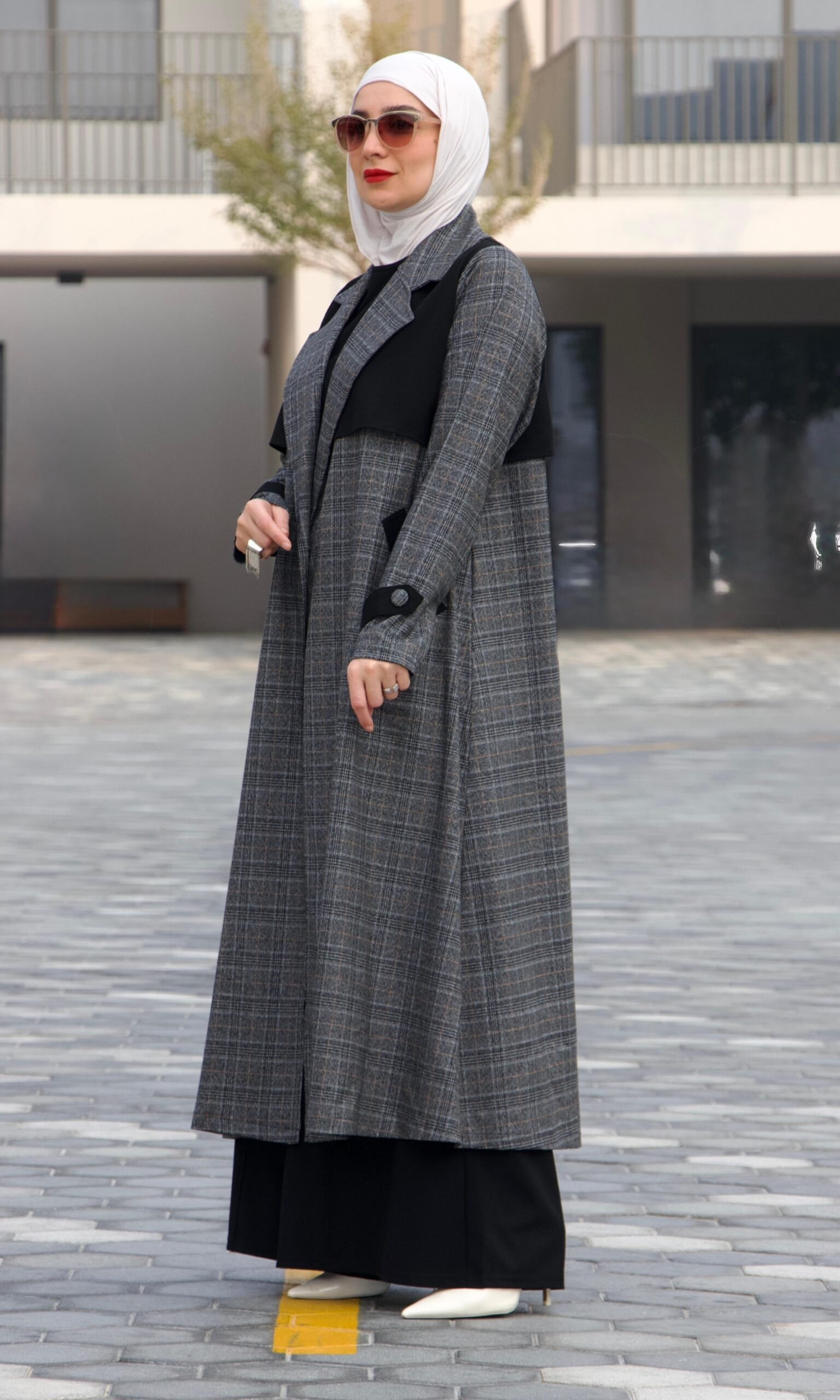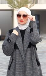 طقم 3 قطع (بلوزة كات سادة لون اسود+ بنطلون عريض سادة لون اسود + جاكيت طويل كاروهات ).